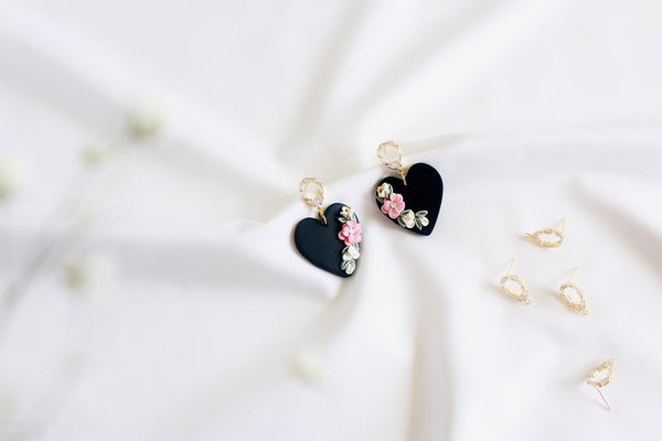 - heart black flower clay earrings