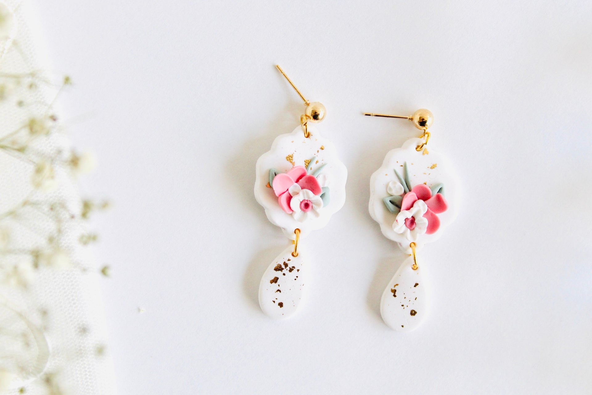 - Spring Flowers Bouquet polymer clay earrings in white | Wedding Clay Earrings| delicate dainty floral clay jewelry spring clay earrings