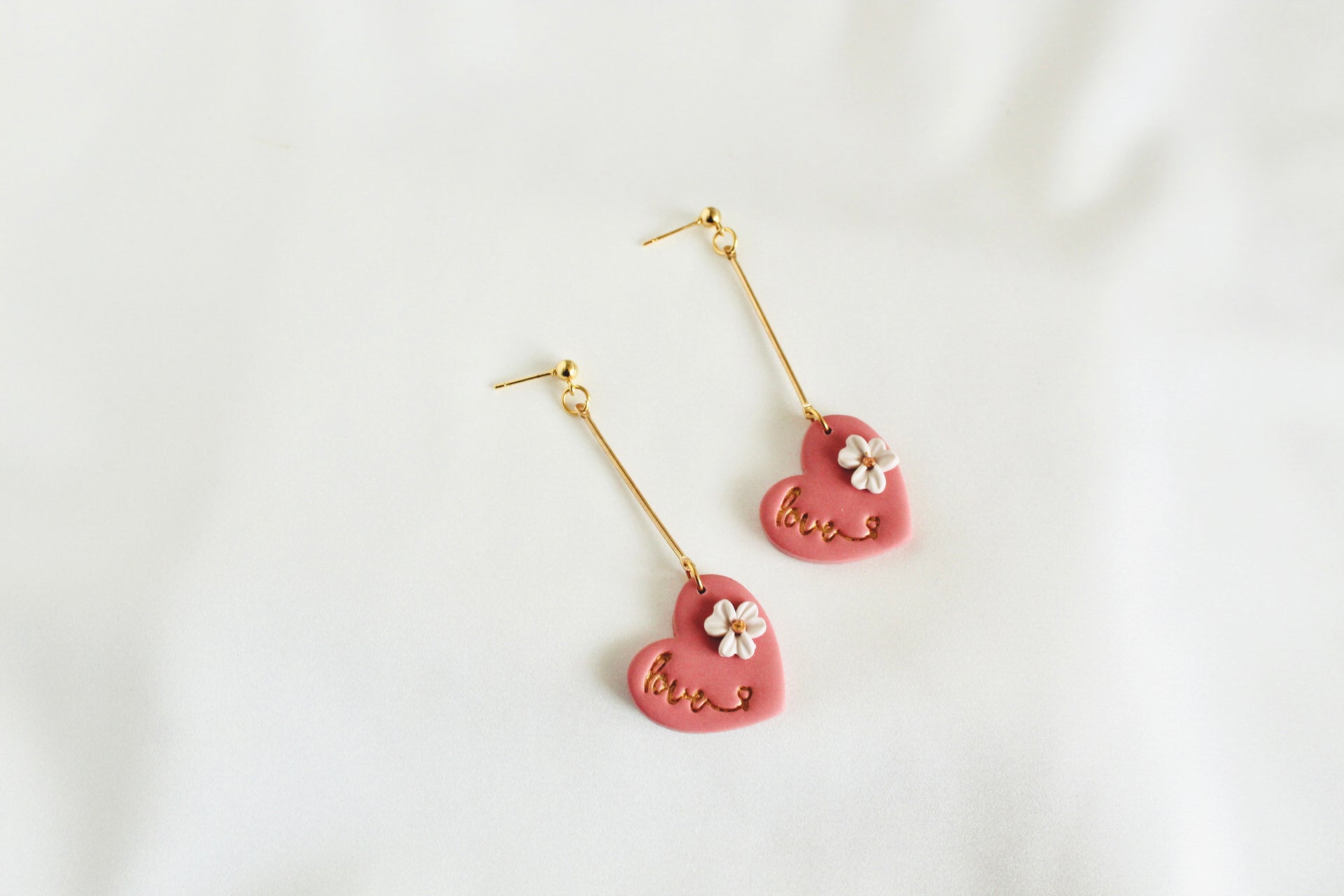 Valentines heart earrings, Embossed heart love stamp clay pink heart clay earrings , valentines love Dangles , floral clay earrings